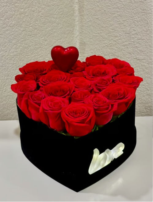 Black velvet heart box with light up love sign and twenty red roses.