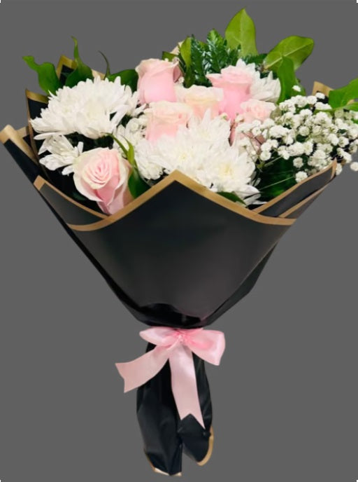 Beautiful bouquet with seven light pink roses and white pom poms.