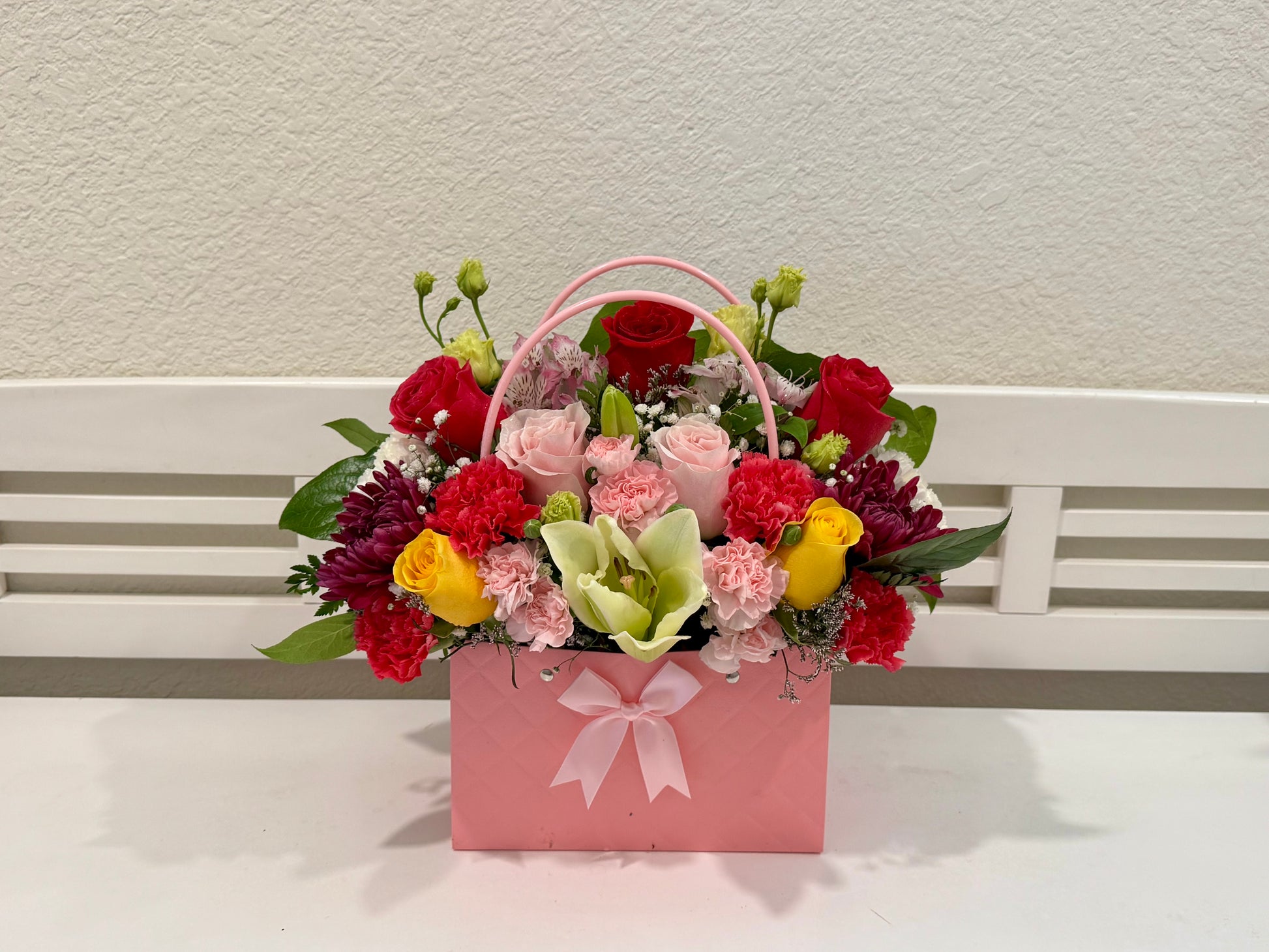 Mix flowers in a glamorous elegant bag. This arrangement is a favorite for birthdays, to give thanks, or just because! Bag can be in color pink, white or black.