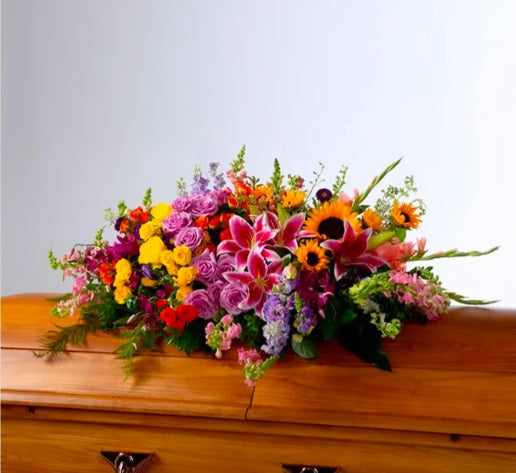 A full celebration of colors, this multi-flower and bright casket spray is representative of a life lived to its fullest. Colors and flowers may change based off of season and availability. Orders should be placed 72 hours in advance of pickup.