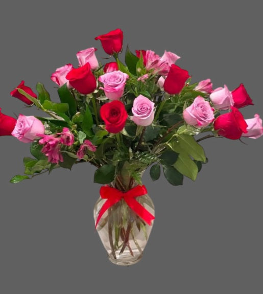 Twenty four tall roses red and purple, 360 view in a glass vase.
