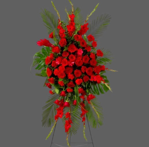 Red is the color of love and this standing spray displays it with luxurious style. Red roses and palms come together with other red and greenery to create a beautiful salute. Orders should be placed 72 hours in advance of pickup.