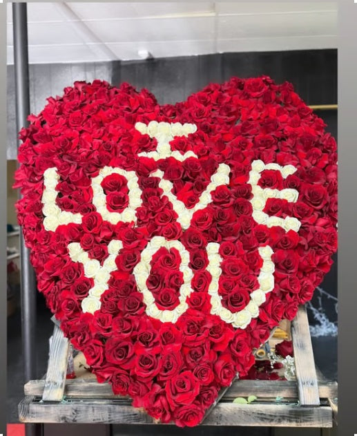 250 open roses on a heart shaped base. This beautiful hear measures 5ft by 4 feet. It’s an amazing piece. Orders should be placed 72 hours in advance of pickup.