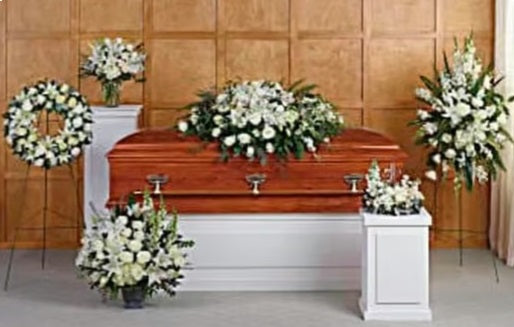 This glorious collection of six hand-made sympathy pieces features pure white roses and lilies for a beautiful sense of peace and tranquility. flowers for this collection can be modified to your color preference. Orders should be placed 72 hours in advance of pickup time. For any special requests please contact at 916-479-3082.