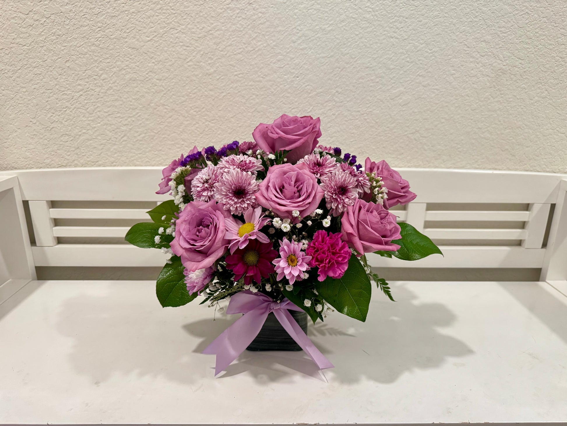 This elegant and beautiful arrangement has an amazing texture of smooth contrast of purple roses, magenta carnations, purple mums purples daisies, statice and a subtle mixture of baby’s breath. This is the perfect arrangement that will lift anyone’s spirit and leave them in awed. Arranged in a glass square cube, approx size: 12” x 12”