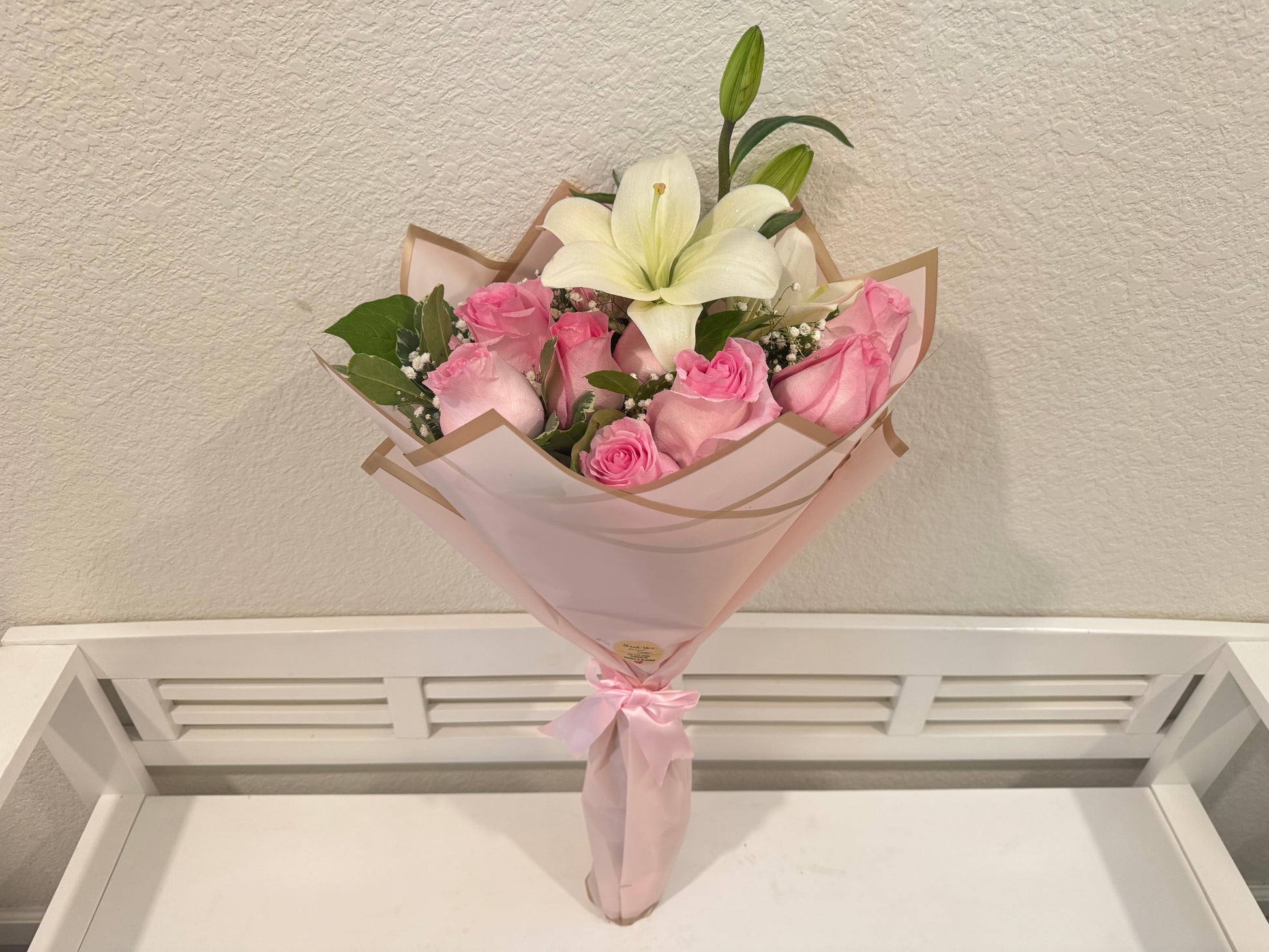 A Six roses bouquet with lilies and greenery wrap beautifully. Color of lily may vary between pink and white.