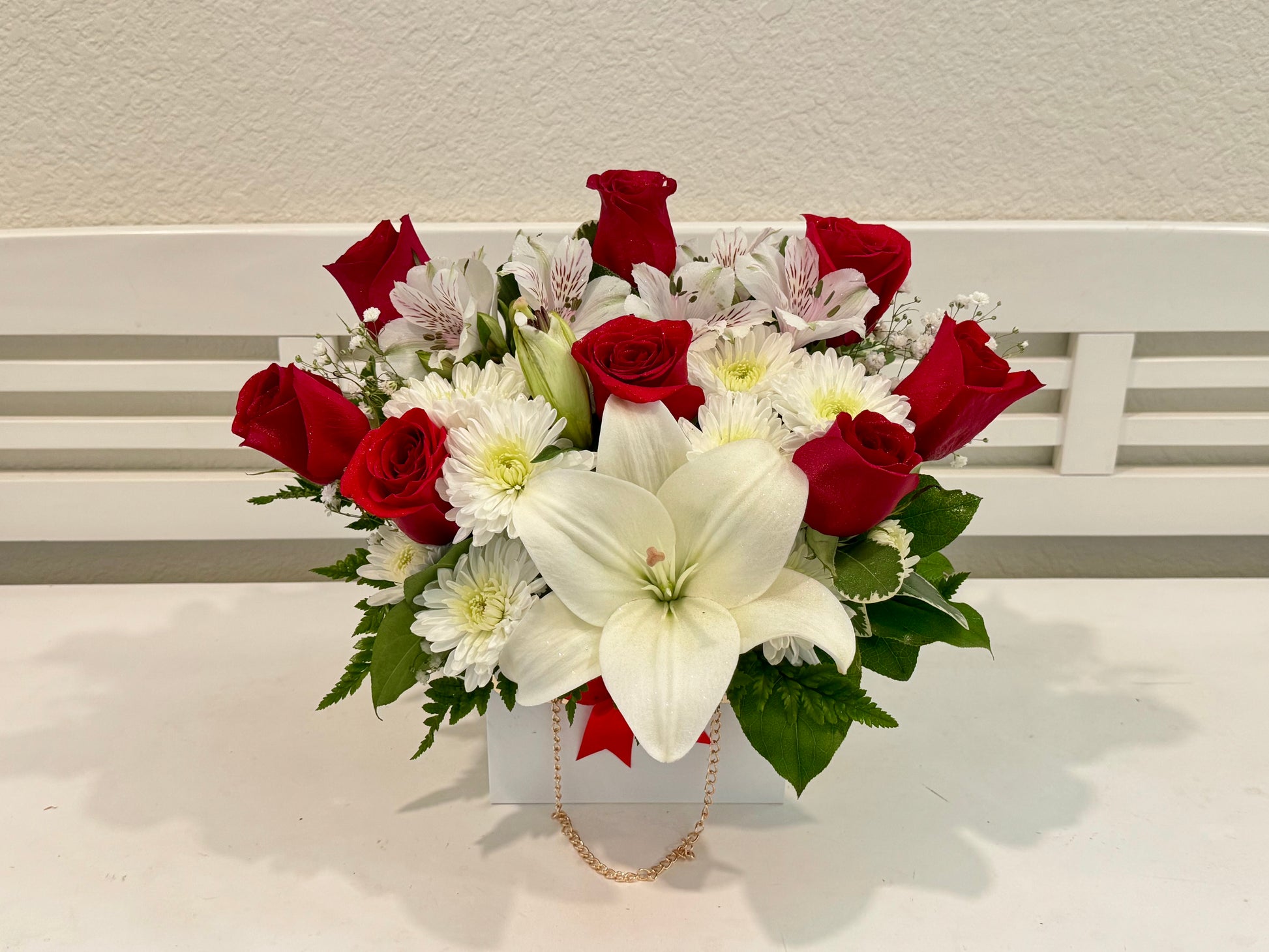 Red roses and Lillie's in a unique bag.