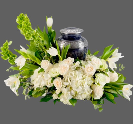 An all white tribute, this all white funeral urn is pure and tranquil. Featuring a variety of white flowers, this urn arrangement compliments the beauty of life. Orders should be placed 72 hours in advance of pickup.