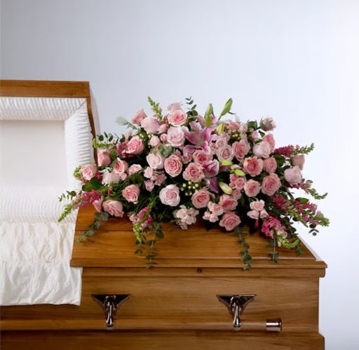 Roses, lilies, and more come together for a blushing pink half casket spray. Sized to fit both open and closed caskets. Orders should be placed 72 hours in advance of pickup.
